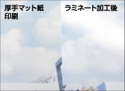 ![]() | 【ラミネート加工】 片面マットラミネート | 印刷物の表面を保護するための加工で、ツヤのない、マットな仕上がりです。 | フチなし仕上げ |