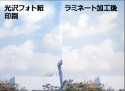![]() | 【ラミネート加工】 片面光沢ラミネート | 印刷物の表面を保護するための加工で、ツルツルと光沢のある仕上がりです。 | フチなし仕上げ |