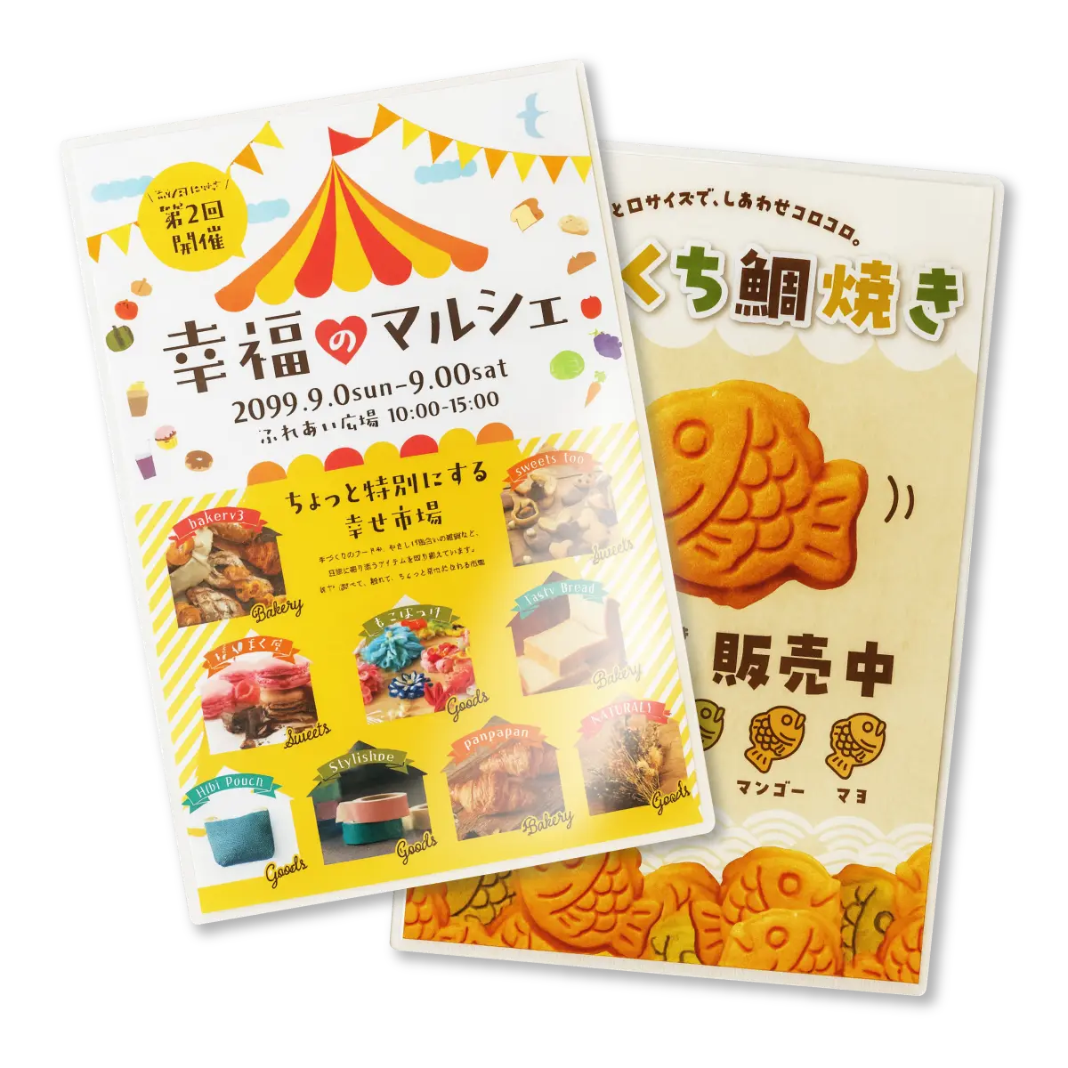 ![]() | 【ラミネート加工】 両面ラミネート | 一般的に使用されている、両面ホットラミネート(パウチ加工)で、耐水性があります。 ※完全防水ではありません。長期間の屋外掲示には不向きです | ラミフチ 3mm仕上げ |