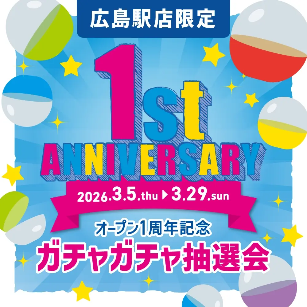 広島駅ビル・ミナモア開業1周年を記念し、お客様への感謝の気持ちを込めて、広島駅店限定で「ガチャガチャ抽選会」を開催中です。